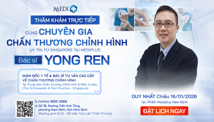 Trong nỗ lực mang các tiêu chuẩn điều trị quốc tế đến với bệnh nhân Việt Nam, bác sĩ Yong Ren sẽ có buổi thăm khám trực tiếp tại MEDIPLUS Nam Định vào chiều ngày 16/1. Đây là cơ hội để người bệnh gặp gỡ chuyên gia và nhận tư vấn về các phác đồ điều trị tiên tiến cho các bệnh lý xương khớp và cột sống ngay tại địa phương.