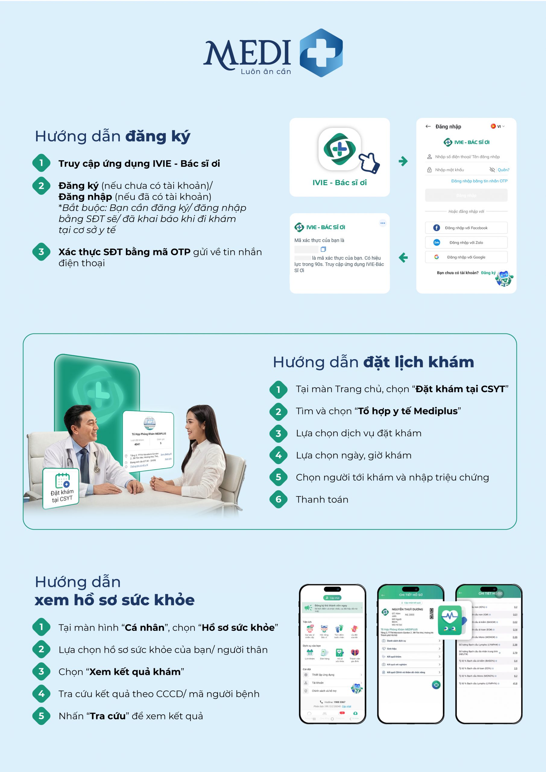 – Toàn bộ dữ liệu cá nhân và hồ sơ sức khỏe trên ứng dụng Mediplus sẽ được đồng bộ đầy đủ sang IVIE – Bác sĩ ơi