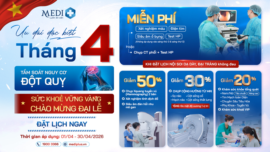 Từ 01/04 đến hết ngày 30/04/2026, khách hàng sẽ được tặng ngay: Xét nghiệm máu + Điện tim + Siêu âm ổ bụng + Test HP hoặc Chụp CT Phổi liều thấp không tiêm + Test HP khi đăng ký Nội soi dạ dày, đại tràng không đau tại Mediplus.